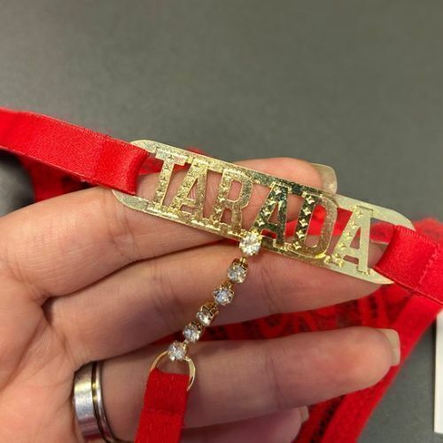 Calcinha com regulagem nas laterais, renda na frente e placa com escrita na parte das costas.